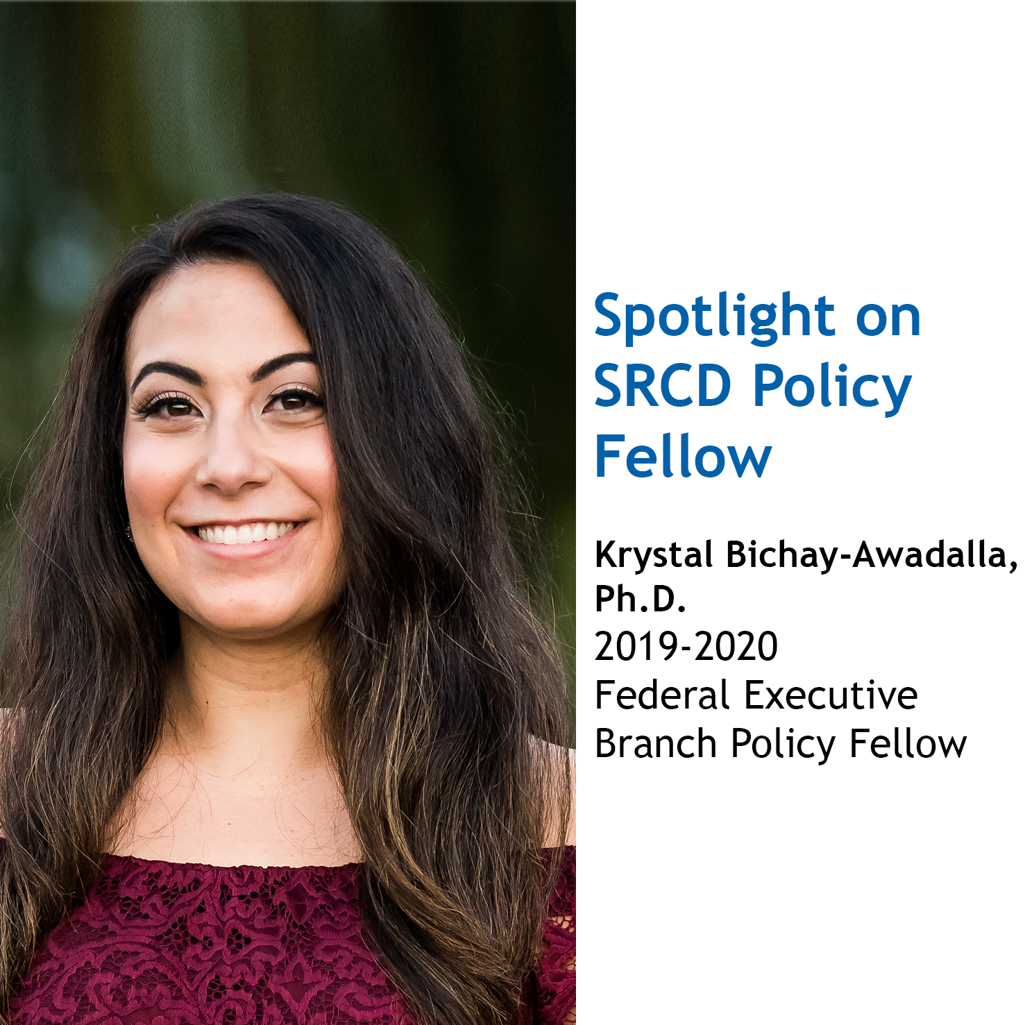 Krystal Bichay-Awadalla is a SRCD Federal Executive Branch Policy Fellow who is placed in the Office of Planning, Research and Evaluation (OPRE), Administration for Children and Families (ACF), U.S. Department of Health and Human Services (HHS)