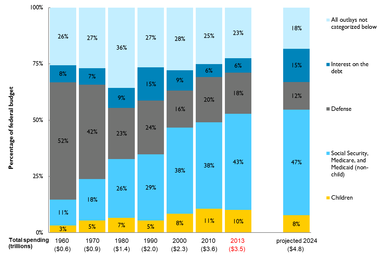 - As a share of gross domestic product between 2013 and 2024, discretionary spending on children is projected to decline 31%, tax provisions 19%, and mandatory spending 9%.